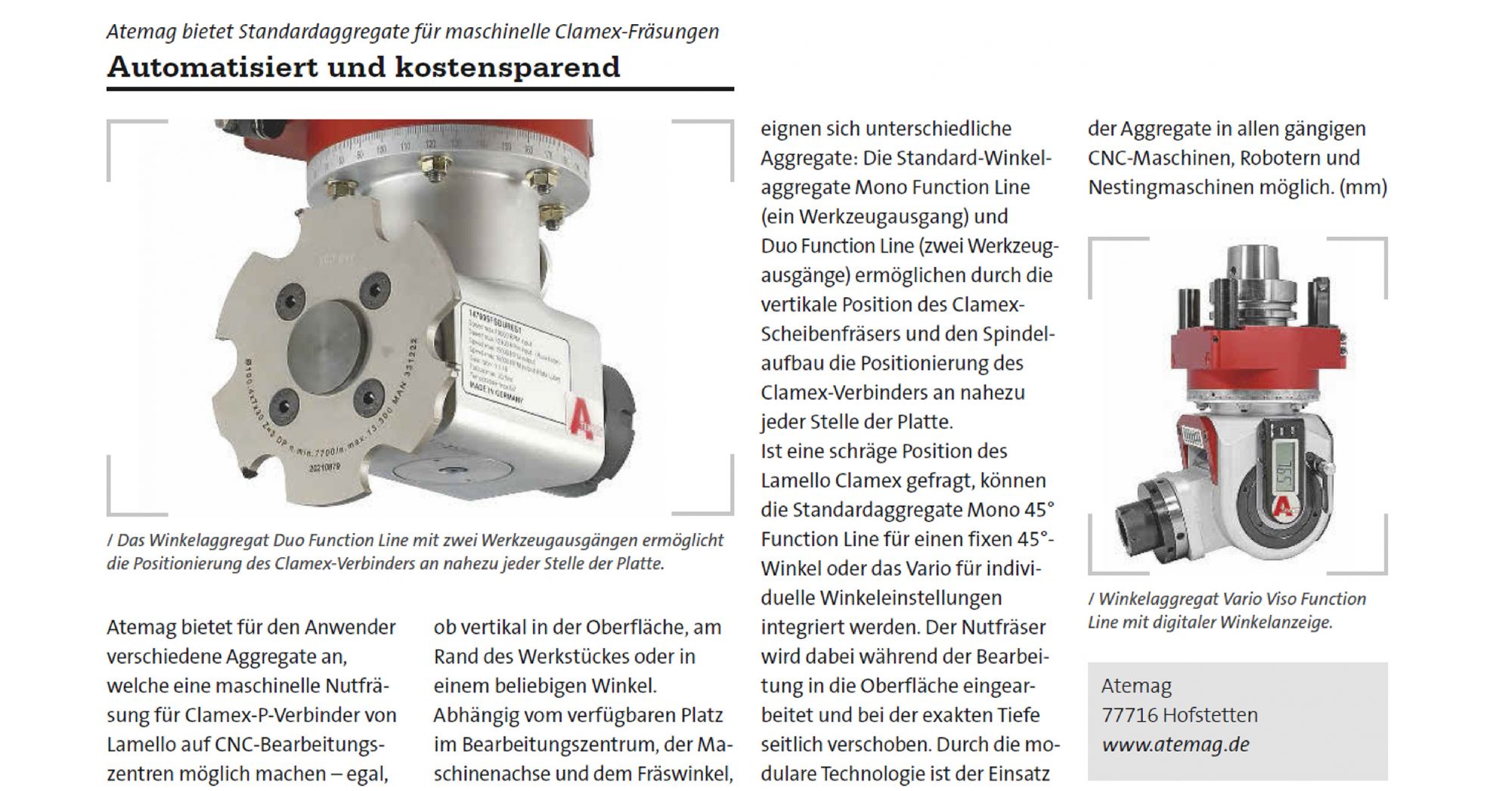 Atemag bietet für den Anwender verschiedene Aggregate an, welche eine maschinelle Nutfräsung für Clamex-P-Verbinder von La mello auf CNC-Bearbeitungszentren möglich machen – egal, ob vertikal in der Oberfläche, am Rand des Werkstückes oder in einem beliebigen Winkel. Abhängig vom verfügbaren Platz im Bearbeitungszentrum, der Maschinenachse und dem Fräswinkel, eignen sich unterschiedliche Aggregate: Die Standard-Winkel - aggregate Mono Function Line (ein Werkzeugausgang) und Duo Function Line (zwei Werkzeug - ausgänge) ermöglichen durch die vertikale Position des Clamex-Scheibenfräsers und den Spindelaufbau die Positionierung des Clamex-Verbinders an nahezu jeder Stelle der Platte.