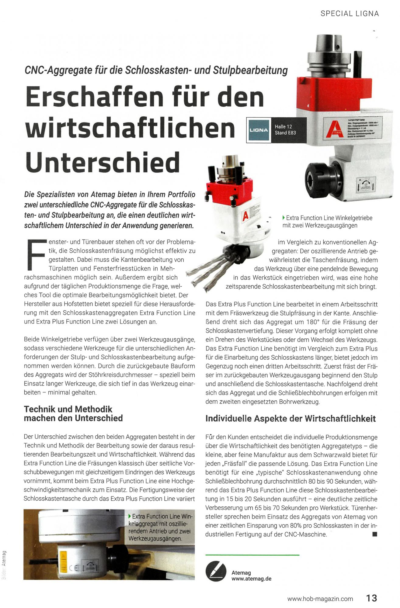 F0r den Kunden entscheidet die individuelle Produktionsmenge über die Wirtschaftlichkeit des benötigten Aggregatetyps - die kleine, aber feine Manufaktur aus dem Schwarzwald bietet für jeden „Fräsfall" die passende Lösung. Das Extra Function Line benötigt für eine „typische" Schlosskastenanwendung ohne Schließblechbohrung durchschnittlich 80 bis 90 Sekunden, während das Extra Plus Function Line diese Schlosskastenbearbeitung in 15 bis 20 Sekunden ausführt - eine deutliche zeitliche Verbesserung um 65 bis 70 Sekunden pro Werkstück. Türenhersteller sprechen beim Einsatz des Aggregats von Atemag von einer zeitlichen Einsparung von 80% pro Schlosskasten in der industriellen Fertigung auf der CNC-Maschine.