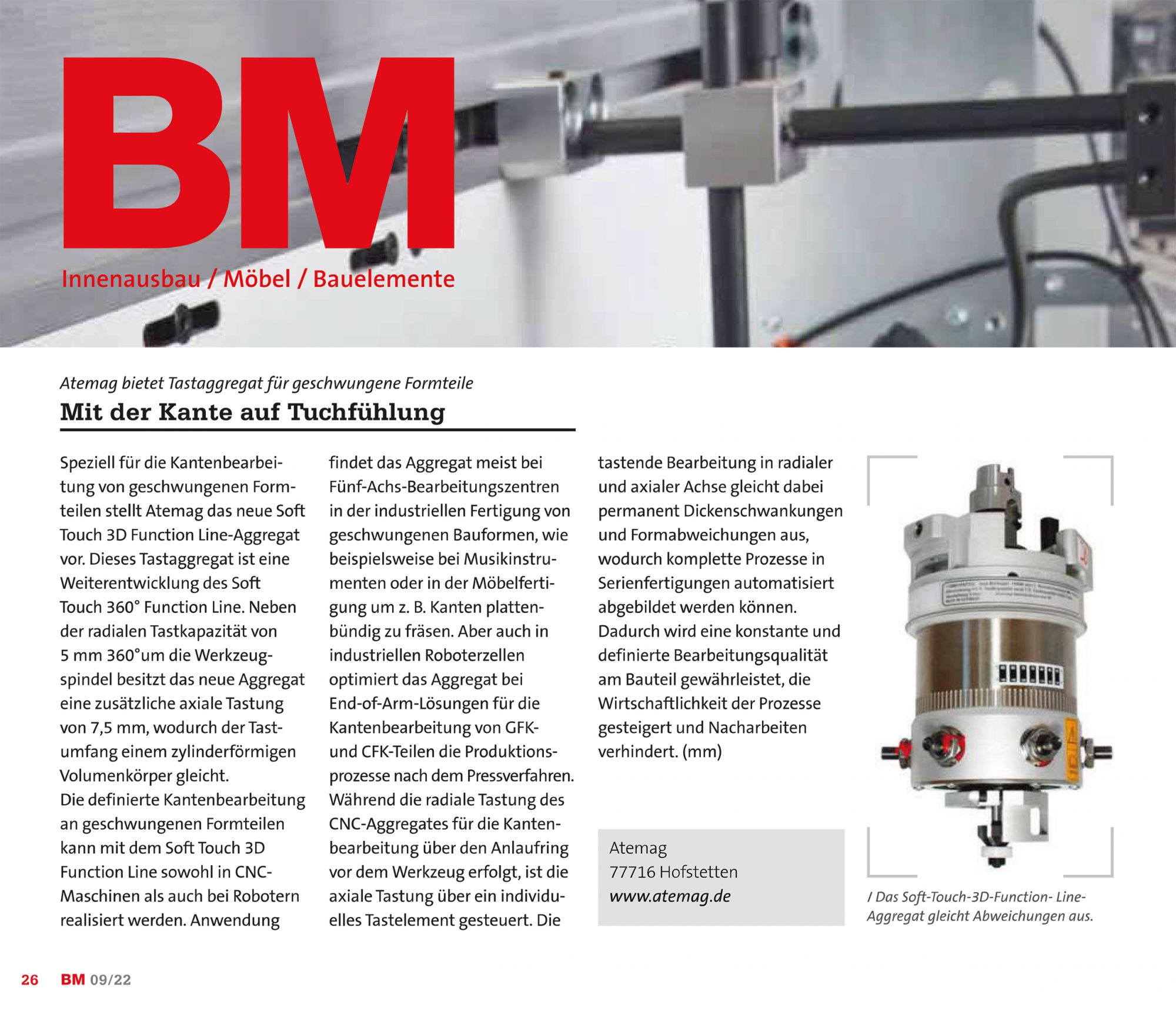 Das BM Fachmagazins widmet sich in der Septemberausgabe 2022 dem Thema "auf die Kante - fertig - los und berichtet über das neue SOFT TOUCH FUNCTION LINE, welches mit radialer und axialer Tastung ausgestattet ist.