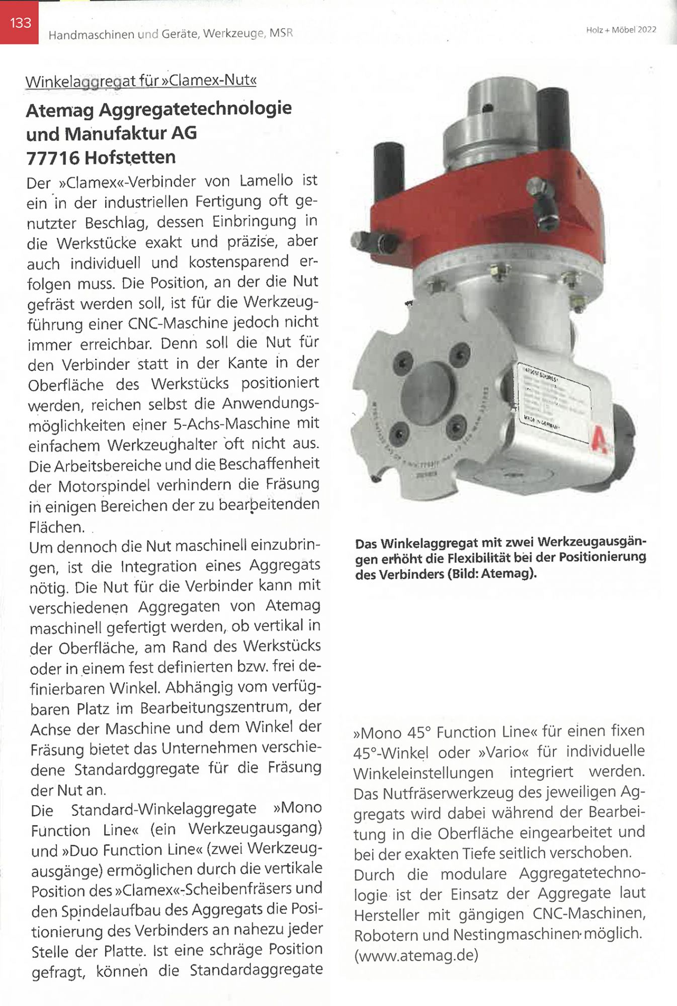 Die Standard-Winkelaggregate »Mono Function Line« (ein Werkzeugausgang) und »Duo Function Line« (zwei Werkzeugausgänge) ermöglichen durch die vertikale Position des »Clamex«aScheibenfräsers und den Spindelaufbau des Aggregats die Positionierung des Verbinders an nahezu jeder Stelle der Platte. Ist eine schräge Position gefragt, können die Standardaggregate Mono 45° Function Une« für einen fixen 45°-Winkel oder »Varia« für individuelle Winkeleinstellungen integriert werden. Das Nutfräserwerkzeug des jeweiligen Aggregats wird dabei während der Bearbeitung in die Oberfläche eingearbeitet und bei der exakten Tiefe seitlich verschoben. Durch die modulare Aggregatetechnologie ist der Einsatz der Aggregate laut Hersteller mit gängigen CNC-Maschinen, Robotern und Nestingmaschinen-möglich. (www.atemag.de).